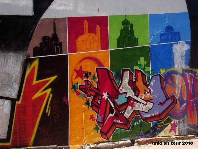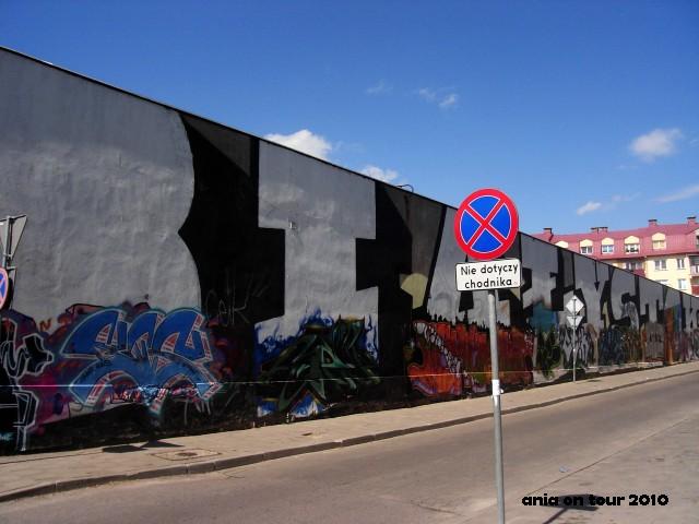 Aż wstyd się przyznać, ale dopiero stosunkowo niedawno (konkretnie po dwóch latach od powstania!) dowiedziałam się o istnieniu świetnego graffiti na ścianie wzdłuż ulicy Kraszewskiego (skrzyżowanie z ulicą Ogrodową, vis a vis szpitala onkologicznego). Na całej długości i wysokości wspomnianej ściany widnieje ogromny napis BIAŁYSTOK. W każdej literze zawarty jest pewien motyw, chociaż obecnie dominują różnorakie wrzuty, które z Białymstokiem za wiele wspólnego już nie mają : – ) No nic, najważniejsze, że uchowały się symbole czterech religii (w literze O). Moim zdaniem super pomysł. Ten fragment graffiti pojawił się swego czasu na stronie głównej Urzędu Miejskiego w Białymstoku : – )