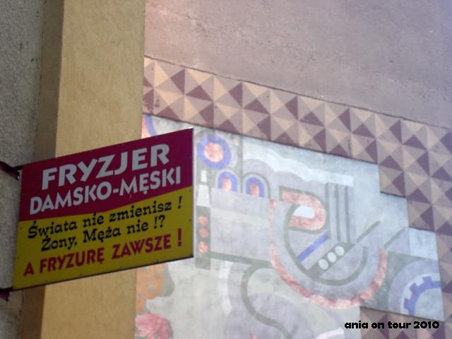 Po drugiej stronie Alei (swoją drogą to ciekawe – Al. Piłsudskiego nie jest jedyną Aleją w mieście, ale wszyscy tak na nią mówią i od razu wiadomo, o jaką Aleję chodzi : D), zaraz przy przystanku dwie kolejne atrakcje. Szyld fryzjera (z jajem, lubię takie szyldy) i kamienica, która popada w ruinę.