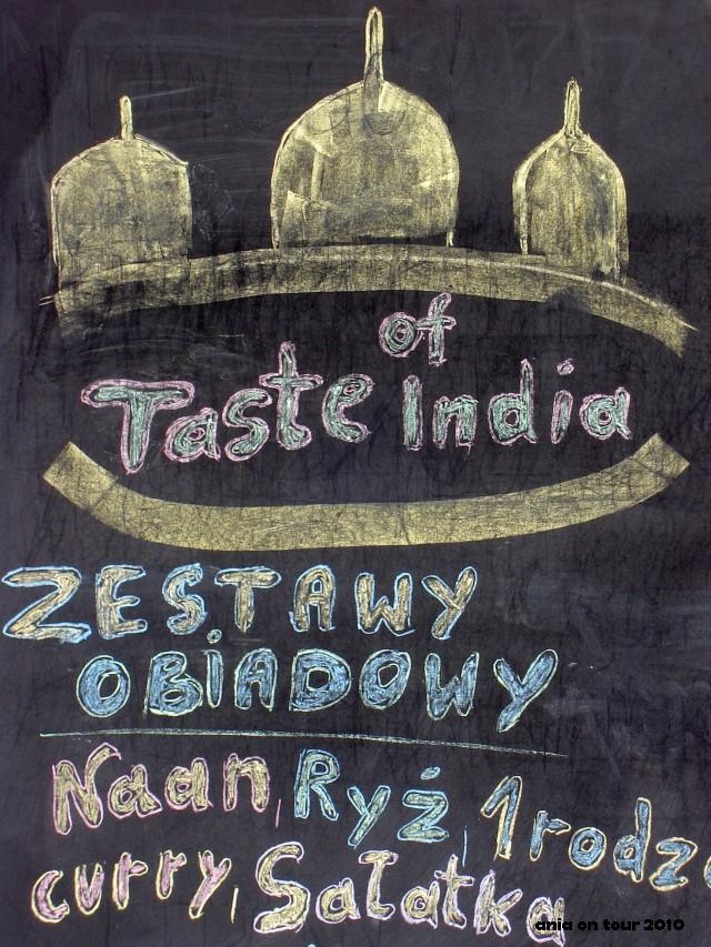 I „smakowa” końcówka. W rzemieślniku przy ulicy Warszawskiej mieści się lokal z kuchnią indyjską. Nie byłam tam, nie jadłam i nie piłam, ale ładnie z niego pachniało, a na szyldzie reklamowym chciało się komuś nawet coś narysować. Można kiedyś spróbować!