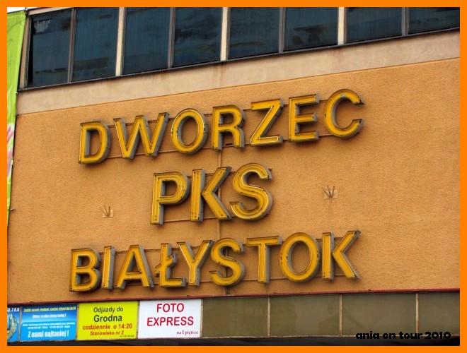 – napis na budynku dworca PKS (ściana frontowa, od strony stanowisk widnieje tylko napis „Białystok”), neon świeci się na zielono: