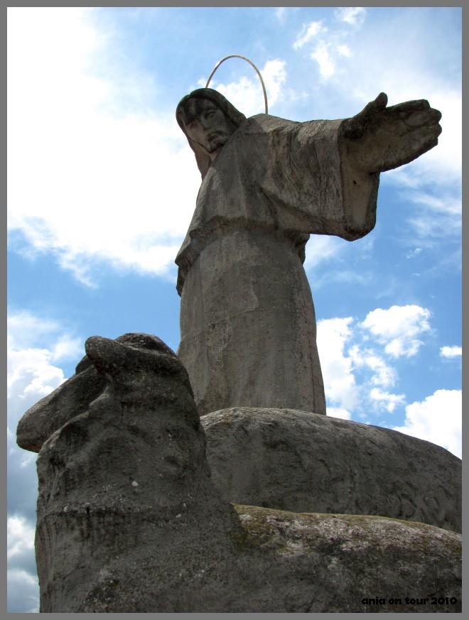 Pomnik Jezusa Dobrego Pasterza na wałach wokół kościoła: