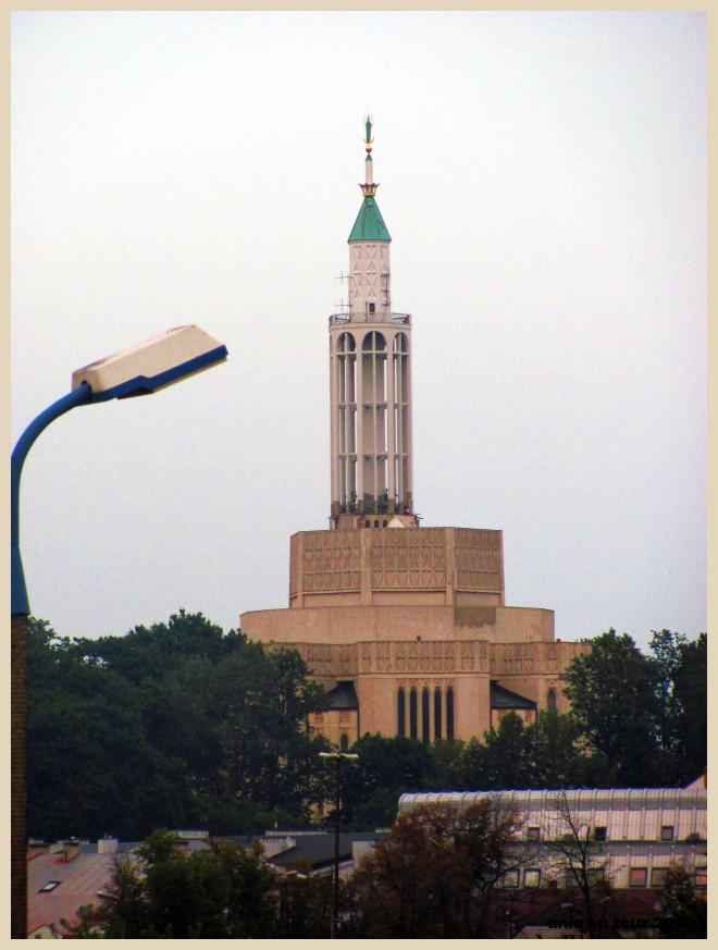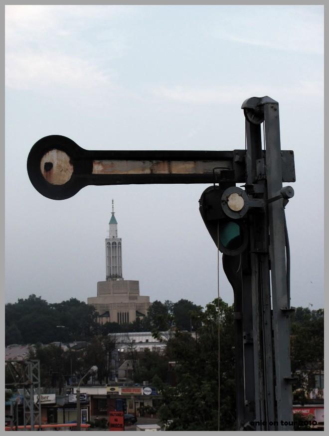 Kościół widziany z kładki nad dworcem PKP. Wydaje się wgnieciony w ziemię przez semafor. Ach, ta perspektywa: