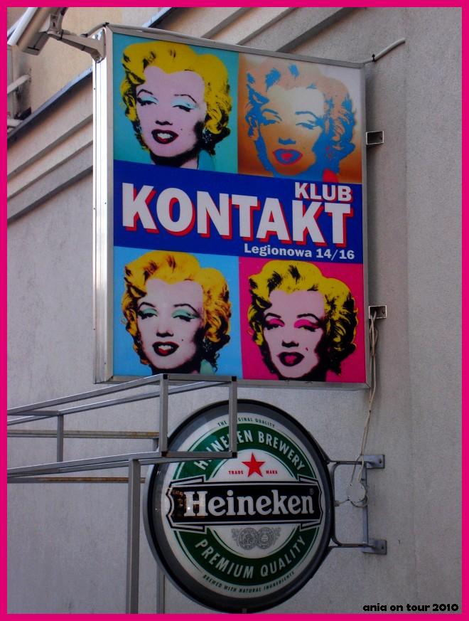 Jeszcze w Wielkanoc cyknęłam kilka zdjęć Kontaktu z zewnątrz. Tak naprawdę dopiero wtedy przyjrzałam się dokładnie „oprawie graficznej”. O samym Kontakcie mogę nawet coś powiedzieć, bo udało mi się tam kiedyś załapać na jakąś imprezę. Wnętrze super, wszystko w klimacie pop-art, trochę oldschoolowe, ogólnie mocna strona klubu. Muzyka jak muzyka, zresztą teraz i tak wszędzie grają prawie to samo. Do wyboru dwa parkiety. Klientela? Przede wszystkim bardzo liczna i starsza, wstęp od 23 roku życia. Bez wcześniejszej rezerwacji nie ma raczej szans na stolik/fotel/kanapę. Przez dość długi czas Kontakt cieszył się opinią najmodniejszego lokalu w mieście, stali bywalcy, przynajmniej ci, których znam, mówią jednak, że dzisiejszy Kontakt to już nie to samo. I chyba im uwierzę. Nie miałam okazji zahaczyć o ten klub w czasach największej świetności, a po mojej wizycie mogę powiedzieć, że jest po prostu przyzwoicie. Ale bez ochów i achów. Ogólnie rzecz biorąc, raczej warto :)