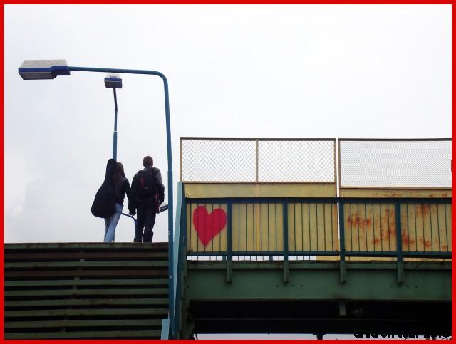 Na przykład te serce na moście kolejowym na dworcu PKP. Samo w sobie jest ciekawe i gdyby nie nadarzyła się taka sytuacja jak poniżej, samo w sobie pozostałoby fajne. Ale zawsze może natrafić się okazja, żeby uchwycić moment. Od razu nasuwa mi się na myśl jeden z moich ulubionych cytatów: „Ich bin ein Clown, und sammle Momente” od Heinricha Bölla. Nie przetłumaczę, bo od razu straci cały swój urok. I tak oto nasze serce nabiera od razu zupełnie innego wyrazu. I kiedy widzimy już taki obrazek jak poniżej, wiemy że samo serce nie byłoby już tak chwytające za serce :)