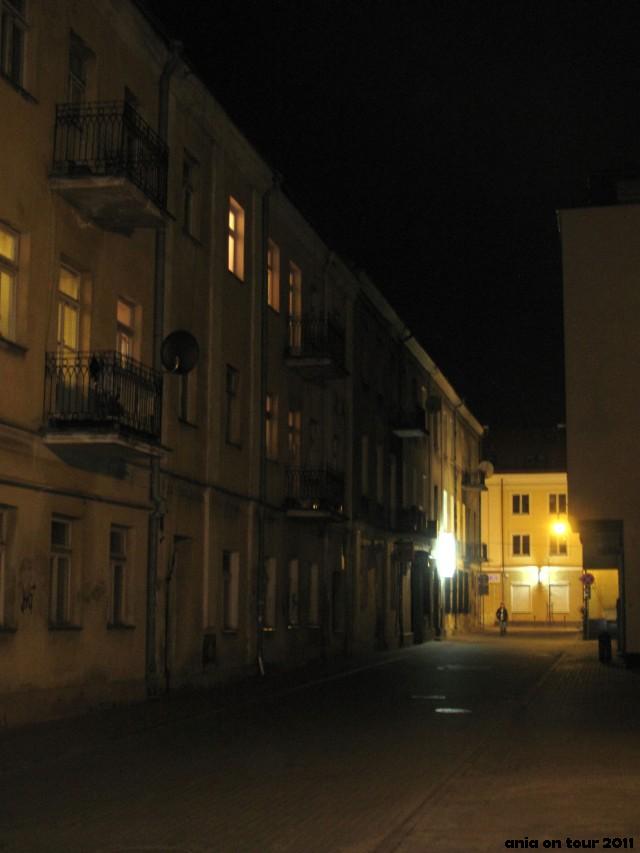 Ci z Was, którzy regularnie czytają to, co zdarza mi się tutaj napisać, pamiętają być może wątek poświęcony ulicy Waryńskiego. Wspominałam o zmianie siatki ulic w centrum miasta po wojnie. Aleja Piłsudskiego, aż ciśnie mi się na usta „jasna, długa, prosta, szeroka jak morze” (ups, to inne miasto ;D), zaburzyła totalnie stary układ ulic prowadzących niegdyś do getta. Dzisiaj ciężko wyobrazić sobie Białystok bez Alei, a tym bardziej jazdę po mieście samą Lipową. Równie ciężko jest jednak wyobrazić sobie ulice Częstochowską, Waryńskiego i Przejazd z lat przedwojennych. Byłam ostatnio właśnie na ulicy Przejazd. Wizyta utrzymana w konwencji „ciemno wszędzie, głucho wszędzie”, liczba napotkanych osób – dwie. Udało mi się zrobić zdjęcie z wyjątkowo pustą Lipową w tle, w związku z tym ul. Przejazd prezentuje się jeszcze bardziej tajemniczo. Kiedy patrzę na te zdjęcie, mam wrażenie, że zostało zrobione gdzieś na południu Polski, kojarzy mi się ze Śląskiem albo chociaż z Łodzią (powiedzmy, że względnie na południu ;P). W Białymstoku po wojnie nie ma już przecież prawie żadnych kamienic. A co dopiero stojących obok siebie!