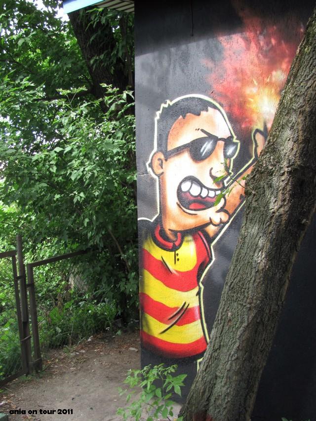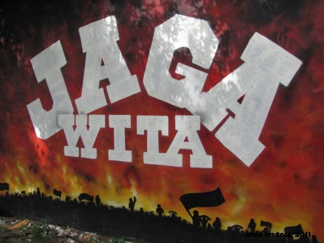W Białymstoku dosłownie roi się (taka pszczela retoryka :D) od graffiti i malowideł poświęconych Jagiellonii. Nierzadko zajmują one całe ściany budynków, mury i inne przybytki. I mają się bardzo dobrze. No cóż, jedno miasto – jeden klub (pozwolę sobie sparafrazować „obcą” rymowankę), kibice nie toczą ze sobą wojen i nikt nie odważy się nawet zamalować „jagiellońskiego” graffiti. To w sumie całkiem fajne. Nie ma żadnych bohomazów jak na przykład na warszawskim Muranowie, gdzie od tandetnych napisów-wyzwisk Legii i Polonii robi się aż słabo. To zadziwiające, jak całe miasto zgodnie kibicuje jednemu klubowi i jak wyrozumiali są kibice na wszystkie porażki Jagi. Ja jestem takim kibicem z doskoku – nie chodzę na mecze, ale wyniki staram się śledzić i oczywiście cieszę się, kiedy Białystok wygrywa. Takie miłe uczucie. Ostatnio natknęłam się na malowidła na budynku przy dworcu PKP (od strony ul. św. Rocha). Proszę bardzo, Jaga wita gości! :)