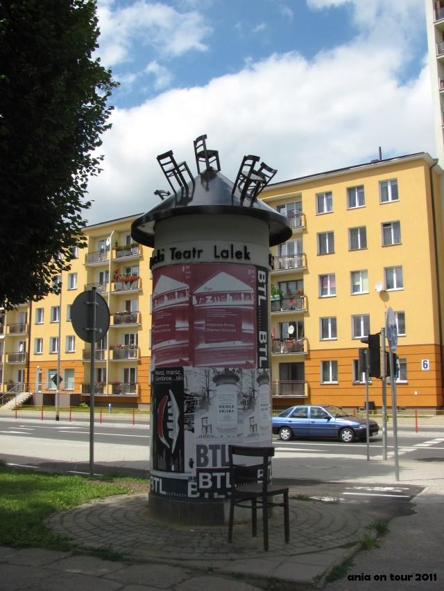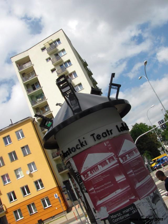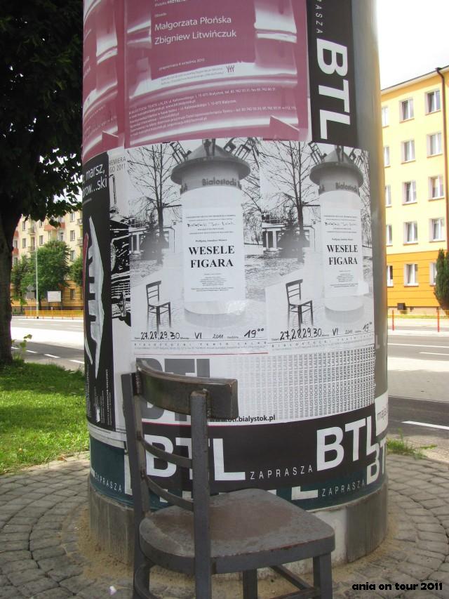 Białostocki Teatr Lalek jest bez wątpienia jednym z lepszych jeśli nawet nie najlepszym teatrem lalkowym w Polsce. Nie mówię tego ze względu na lokalny patriotyzm, ale takie są po prostu fakty :) Na scenie przy ulicy Kalinowskiego wystawiane są sztuki dla dzieci i dorosłych, w teatrze pracują aktorzy znani szerszej publiczności z czołowych ról w serii filmów Bromskiego „U Pana Boga …”, między innymi słynny komendant z Królowego Mostu. Jako dziecko często chodziłam do tego teatru i wspomnienia mam ogólnie bardzo pozytywne. Po przedstawieniu można czasem zejść pod scenę i zobaczyć, jak praca aktora-lalkarza wygląda „od środka” – bardzo fajne przeżycie, a mnogość lalek nie do opisania. Przed teatrem jest z kolei specjalny słup ogłoszeniowy z informacjami o nowych sztukach. Bardzo podoba mi się motyw krzeseł – zresztą sami zobaczcie!