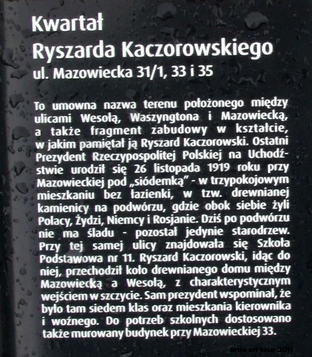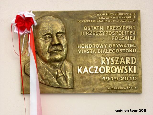 Ryszard Kaczorowski, ostatni prezydent RP na uchodźctwie, przez całe życie był bardzo związany ze swoim rodzinnym Białymstokiem i zawsze wyrażał się o tym mieście bardzo ciepło. Tę miłość do Białegostoku udało mu się „przerzucić” również na jego żonę, Karolinę Kaczorowską, która wciąż, już po śmierci męża, pojawia się w mieście i wspiera różne inicjatywy. Myślę, że Kaczorowski był bardzo ważną postacią dla miasta, nic też dziwnego w tym, że radni miejscy nie tak dawno bez żadnych wątpliwości nadali jego imię nowo wytyczonej ulicy przebiegającej tuż obok miejsca, w którym stał kiedyś jego rodzinny dom. Prezydent urodził się w domu przy ulicy Mazowieckiej. Tam też chodził do szkoły. Niewiele zachowało się w tym miejscu budynków pamiętających dawne czasy, niestety. Dlatego, chyba trochę rychło w czas, ale jednak, postanowiono ochronić to, co przetrwało i wytyczono tzw. „kwartał Ryszarda Kaczorowskiego” w rejonie ulic Mazowieckiej i Wesołej, który znalazł się na szlaku architektury drewnianej (też dość nowa inicjatywa). Marzyłoby mi się, żeby w tych starych budynkach – narożnej drewnianej kamienicy, murowanym domu i w budynku dawnej szkoły, do której chodził kiedyś też i mój dziadek, na nowo kwitło życie. Żeby znalazły się środki na ich renowację i dobre pomysły na ich zagospodarowanie. Byłoby miło … Tymczasem odsłonięto tablicę poświęconą Kaczorowskiemu, a w całej fecie wziął udział nawet prezydent RP. Zapraszam do zdjęć: