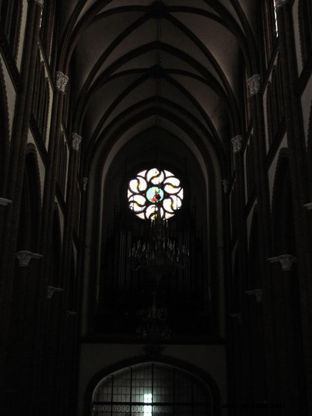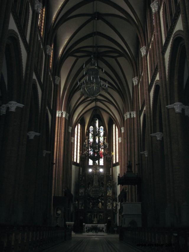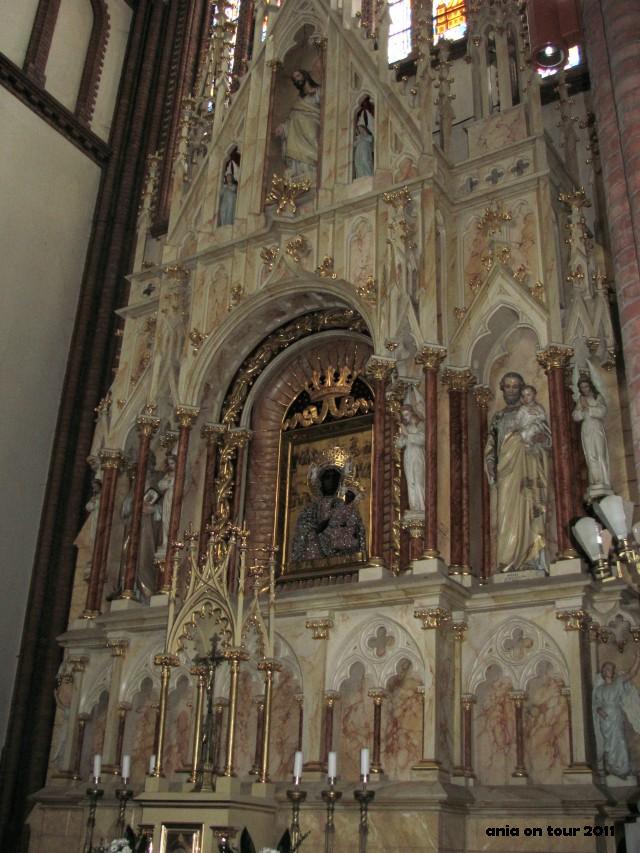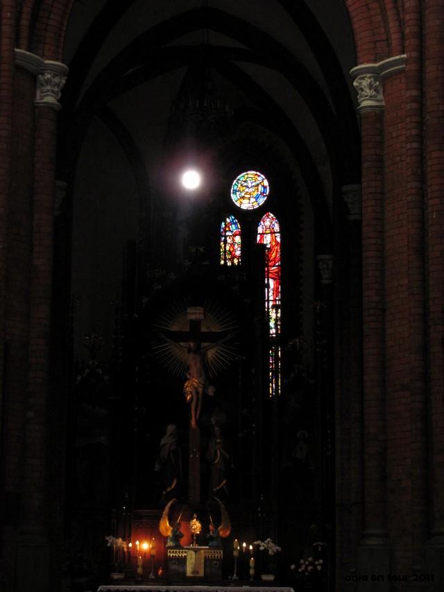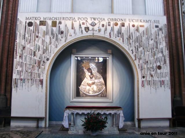Wnętrze fary jest dla mnie kwintesencją kościoła. Zdjęcia są trochę za ciemne, ale robiłam je w sobotę, kiedy światła nie były włączone. Można chyba jednak wynieść ogólne wrażenie, jak ten kościół wygląda. Bardzo ładnie prezentuje się ołtarz z obrazem Matki Boskiej Częstochowskiej. Natomiast przeciwległy ołtarz z obrazem Matki Boskiej Ostrobramskiej jakoś do mnie nie przemawia. Coś bym tam zmieniła, żeby wyglądał poważniej, dostojniej. Nie przypominam sobie, żebym wspominała, jak doszło do tego, że w Białymstoku znajduje się kopia słynnego obrazu z Ostrej Bramy w Wilnie. Na stronie białostockiej katedry możemy znaleźć obszerny artykuł na ten temat: Katedra Białostocka – sanktuarium