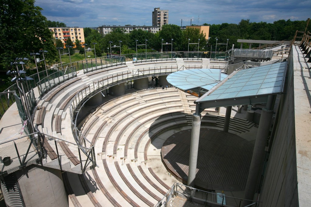 W internecie natrafiłam na zdjęcie amfiteatru wkomponowanego w kompleks Opery. Natomiast na stronie Wrota Podlasia obszerna relacja z budowy i zdjęcia wnętrza budynku (Wrota Podlasia – Opera Podlaska)