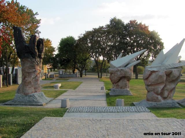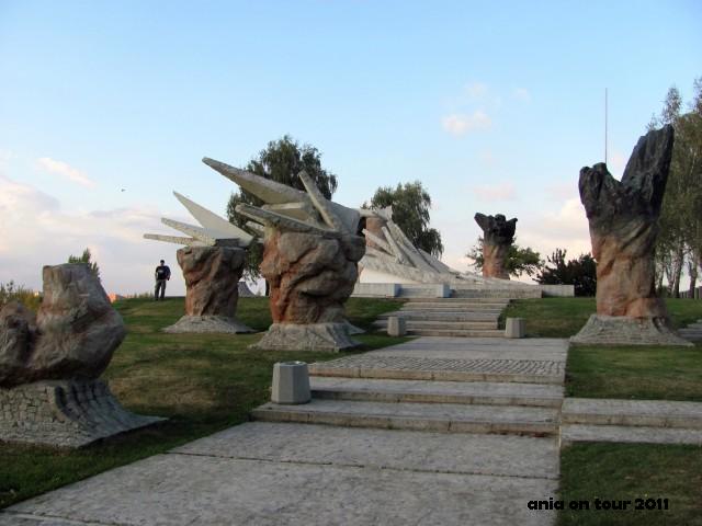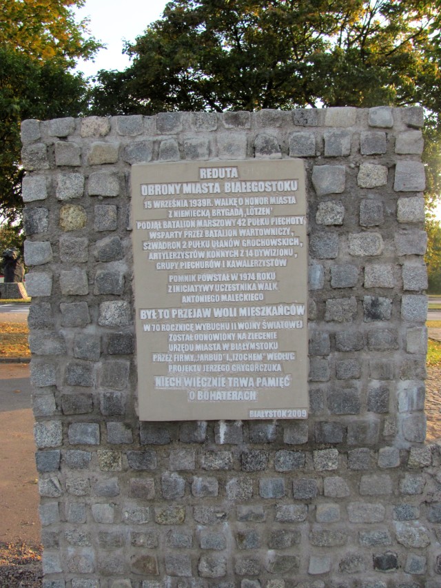 Przy Alei Jana Pawła od strony wjazdu z szosy warszawskiej stoi dość nietypowy pomnik, składający się z pni drzew. Jest to pomnik Obrońców Białegostoku, którzy 15.09.1939 roku walczyli w tym miejscu o honor miasta. Czoła niemieckim żołnierzom z brygady Lötzen stawił Batalion Marszowy 42 Pułku Piechoty. Na pamiątkę tamtych wydarzeń wzniesiono w 1974 roku ten dziwny pomnik. Dwa lata temu całe wzgórze przeszło gruntowny remont i wreszcie można je pokazać szerszej publiczności. Z reduty rozciąga się widok na położone w oddali Bacieczki. Bardzo ładnie widać też kościół na Wysokim Stoczku. Niestety, do czasu. Dosłownie za płotem powstaje właśnie duże osiedle mieszkaniowe. Zawsze mnie intrygowało, kto kupuje nowe mieszkania przy trasie wylotowej na Warszawę. Jaka to frajda tak mieszkać? :)