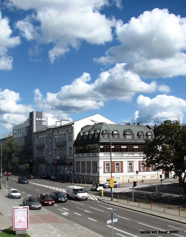 Podczas zeszłorocznych wakacji coś zagnało mnie na pierwsze piętro budynku o szumnej nazwie Centrum Jurowiecka, który kojarzy mi się właściwie tylko z pierwszym Rossmannem w mieście :) O dziwo drzwi na taras były otwarte, więc postanowiłam skorzystać z okazji i zobaczyć, jak wygląda ulica Sienkiewicza trochę z góry. W sumie nieźle. Zrobiłam kilka zdjęć, ale tylko te od strony ulicy Warszawskiej się udały, ponieważ nad górną częścią Sienkiewicza rozpościerało się palące słońce. Zatem dziś widok na banki :) I ładne chmury na błękitnym niebie.