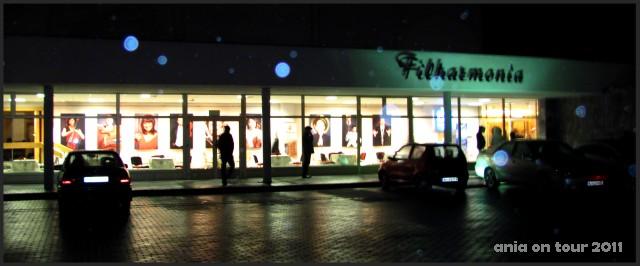 W minioną sobotę byłam na koncercie w białostockiej filharmonii (ups, w Operze i Filharmonii Podlaskiej!). Koncert, w przeciwieństwie do typowej listopadowej pogody, bardzo udany, a jakże! Muszę przyznać, że ostatni raz byłam w filharmonii chyba jeszcze w liceum. W środku nie zmieniło się wiele, pamiętam już dużą salę koncertową po remoncie. Moją uwagę zwróciły jednak ogromne zdjęcia muzyków w hallu (a może powinnam napisać w foyer?) – wieczorem prezentowały się z zewnątrz bardzo ciekawie, co może nie do końca widać na poniższym zdjęciu :) -bądźcie wyrozumiali -było zimno i padało, a ja taka bez parasola i koncertowo ubrana … Ale zachęcam Was szczerze do obejrzenia tych zdjęć. Najlepiej udać się na plac przy ul. Podleśnej w jakiś koncertowy wieczór. Tyle ludzi się tam wtedy przewija, wszystko pięknie podświetlone, coś się dzieje ;)