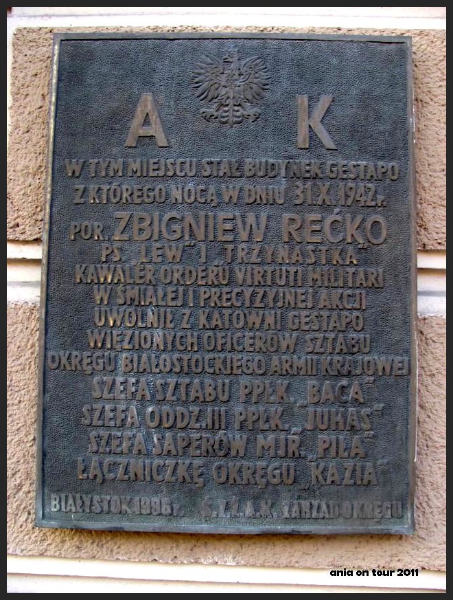 Byłam w szoku, chodziłam tamtędy milion razy i nie widziałam. Dopiero dziś, przy okazji wycieczki z PTTK, przewodnik nam ją pokazał. Powiedział nam też, że siedziba gestapo, z którego Zbyszek uwolnił więźniów znajdowała się w Hotelu Ostrowskiego przy Sienkiewicza 15, który to hotel był w miejscu zatoczki autobusowej, za Białką.