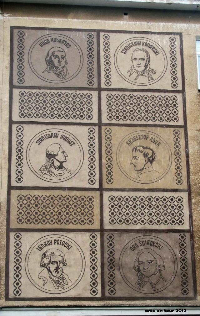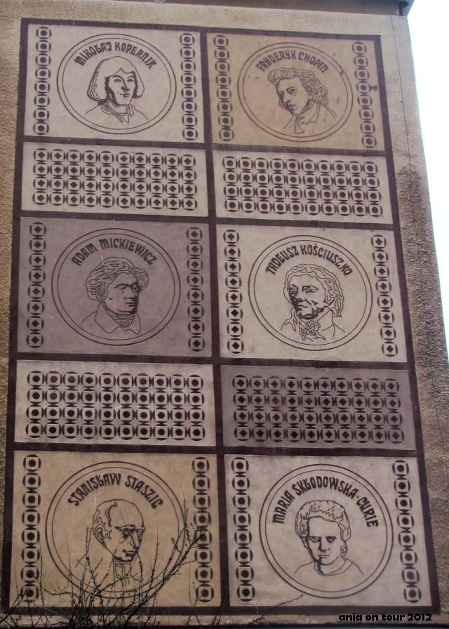 Na elewacji gimnazjum przy ulicy Stołecznej znajdziemy całą plejadę wielkich Polaków w formie sgraffito. To „Poczet wybitnych Polaków” autorstwa Wiesława Jurkowskiego powstały w latach siedemdziesiątych. Wszystkich zainteresowanych tym zagadnieniem odsyłam do mojej notki z początków działalności: ludowo. kolorowo. To zabawne, ale byłam pod tym gimnazjum drugi raz w życiu. A uczyłam się swego czasu nieopodal … :) Ulice Stołeczna i Sukienna skrywają wiele tajemnic. Mam kilka zdjęć z niedawnego spaceru, więc niektóre z nich na pewno tutaj opublikuję!