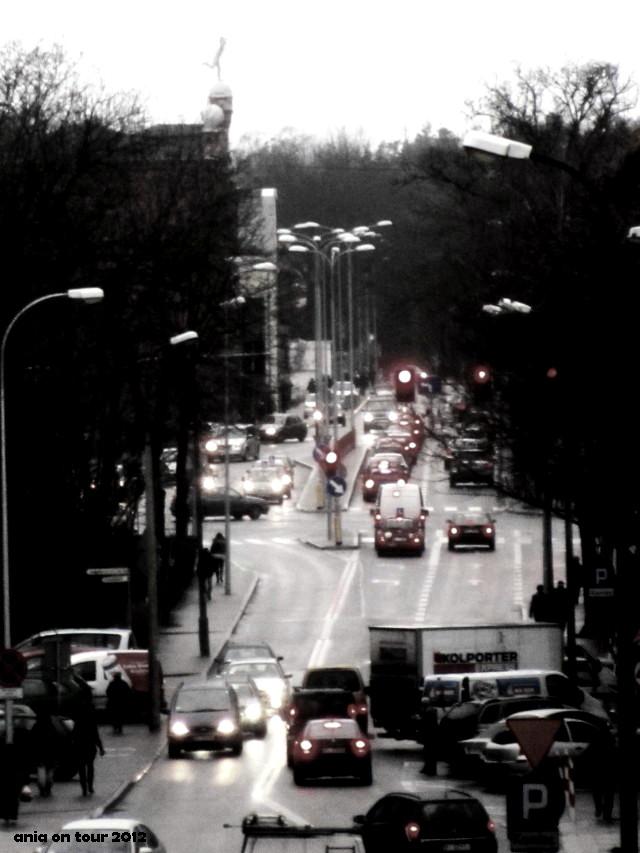 To nic wielkiego, ale przechodząc niedawno ulicą Warszawską na wysokości ulicy Świętojańskiej zerknęłam w dół i zobaczyłam w oddali taki oto obrazek. Gdybym miała lepszy zoom, mogłabym pewnie pokazać figurę na szczycie dawnej fabryki Beckera (dla niewtajemniczonych – Galerii Alfa). Ale nie mam, zatem macie przed sobą głównie ulicę:)