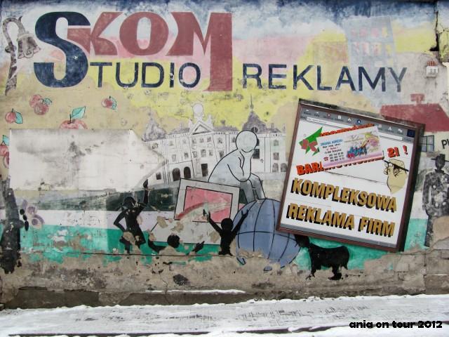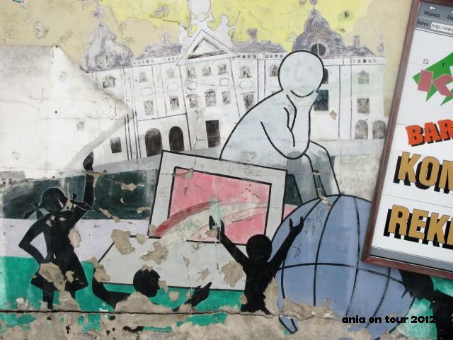 Graffiti czy mural? A może nic z tych rzeczy? W każdym razie jest. Obok wspomnianej w poprzednim poście przychodni na Białówny możemy zobaczyć na murze taką osobliwą reklamę z Pałacem Branickich. Czas ją już posunął, być może niedługo zniknie. Żadna to sztuka, ale jednak fajnie zobaczyć kawałek miasta namalowany na ścianie :)