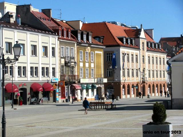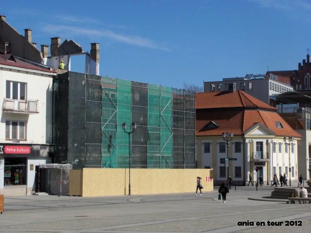 Przez Rynek tym razem tylko przemknęłam. Zrobiłam kilka zdjęć scraffitom na budynkach (o nich później) i poleciałam do parku. Jednak nawet przez tych kilka chwil było na Rynku przyjemnie i tak jakoś świeżo. Nowy sezon w powijakach. Ale na fontanny poczekamy ponoć aż do maja. Z takich szybkich obserwacji – bank PKO tradycyjnie ładnie się prezentuje. Ludzie wyszli posiedzieć na ławkach obok głogów (przypominam hasło „Białystok miastem głogów”, silną konkurencję dla „Białystok miastem Miłosierdzia” :D). Przed galerią pod filarami handel nielegalny kwiatkami kwitnie, chociaż przybyło tabliczek informujących o zakazie. Kamienica Frankowskiego (może nowa nazwa zwyczajowa?) jest, a jakoby jej nie było. I o tej kamienicy napiszę kilka słów więcej. Tomasz Frankowski, gwiazda Jagiellonii Białystok, Franek łowca bramek, remontuje kamienicę przy ulicy Sienkiewicza 3. Mają się w niej znaleźć sale konferencyjne, restauracja, sklepy i klub jazzowy (to ostatnie przemawia do mnie jakoś najsilniej). Jak wiecie, a Ci, którzy nie wiedzą, niech się cieszą, że nie widzieli, budynek ten straszył nas już wiele lat. Taka pluskwa w samym centrum. Obwieszana reklamami na szmatach. Dawna siedziba Towarzystwa Przyjaźni Polsko Radzieckiej z lat 50, w której działał kiedyś kultowy EMPiK wraz z kawiarnią. Wcześniej, dawno temu, austeria „Pod Łosiem”. Nowy projekt nie zachwyca. Jest taki … plastikowy. Ponoć nie podoba się nawet samemu architektowi. W nowym projekcie nie ma miejsca na balkon. A ja widziałabym tam kawiarnię … Heh, marzycielka. Tak sobie myślę, że skoro z budynku prawie nic nie zostało (widzicie zdjęcie?), to ideałem byłoby odbudowanie pięknej kamienicy z kolumnadą, która po wojnie nie była aż tak strasznie zniszczona, ale podzieliła los hotelu Ritz – nadający się do remontu piękny budynek nie spodobał się sąsiadom ze Wschodu. Niemcy zaczęli, a wyście skończyli! Kamienica ma być oddana do użytku w trzecim kwartale tego roku. Trzymam kciuki. Później przydałby się ktoś, kto nadałby nowy wygląd kamienicom-klockom tuż obok …