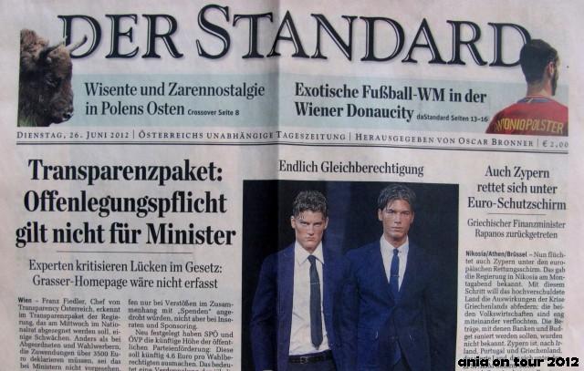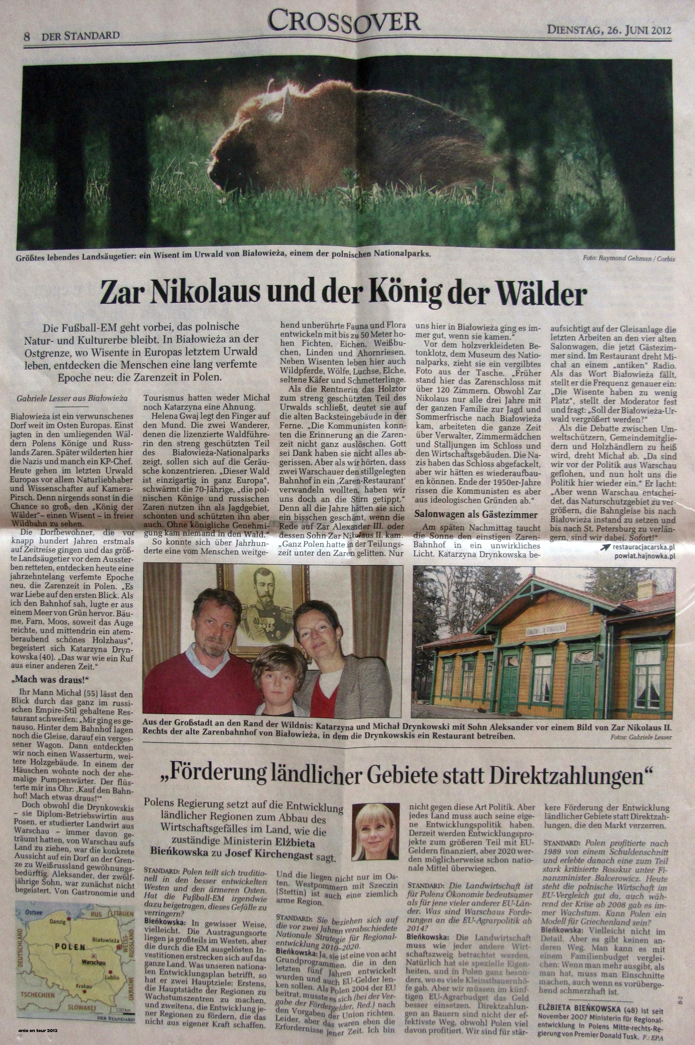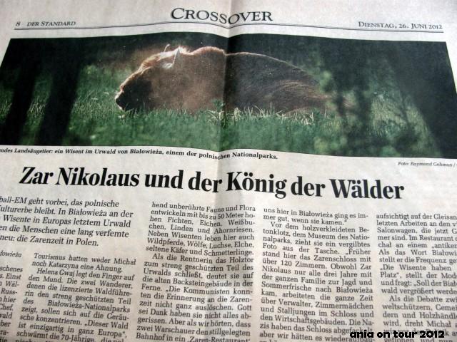 Wczoraj dostałam wydanie austriackiego „Der Standard” z 26.06.2012 roku i już z pierwszej strony spojrzał na mnie ktoś znajomy :) Na stronie 8 znajdziemy obszerny artykuł o Białowieży. Oczywiście nie dowiemy się raczej niczego nowego (mam na myśli nas, ludzi z Podlasia :D), ale przeciętny Austriak, który pewnie nawet nie wiedział o istnieniu tej puszczy, ma wreszcie szansę zlokalizować ją na mapie ;) Jestem też pozytywnie zaskoczona, że wyraz „Białowieża” zapisano z polskimi znakami diakrytycznymi – to naprawdę rzadkość w niemieckojęzycznej prasie (a może powinnam napisać po prostu „zagranicznej”?). Wszystkich znających język niemiecki zachęcam mimo wszystko do lektury – dobrze wiedzieć, jak promują nasz region nad Dunajem :) Zastanawia mnie jednak ta nostalgia za carem Mikołajem … Tutaj dziennikarkę poniosła chyba fantazja, a może dał o sobie znać zwyczajny brak znajomości tutejszych realiów, bo chyba ciężko wspominać ten czas z rozrzewnieniem …