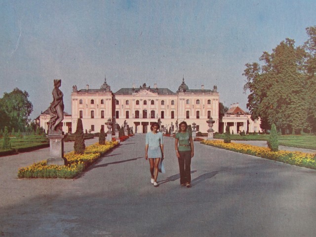 Te panie przed Palacem Branickich maja ubior z konca lat 60, na nogach modne wtedy drewniaki potoczne zwane sabotami, spodnie dzwony, bardzo krotka minispodniczka, pasek na bluzce, wow, moja ciotka ma zdjecia z tego okresu w podobnych ciuszkach :-) Bede strzelac, 1968-69 :-)
