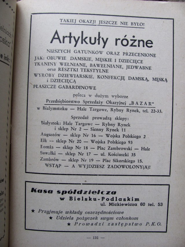 W czasie deszczu dzieci się nudzą … Jak widać duże dzieci również. Niepocieszona faktem, iż ciągle pada i nie mogę zrobić nowych zdjęć na bloga, postanowiłam poszukać materiałów na bloga w domu. I znalazłam. Nie tylko album o Bojarach, ale i stary przewodnik „Białystok i okolice” z roku 1956. Kupiłam go kiedyś za grosze na allegro. Jest to książka do bólu propagandowa, ale ciekawa jako pewnego rodzaju eksponat. I w wielu kwestiach wciąż aktualna … Przekonacie się o tym sami, kiedy przeczytacie wybrane przeze mnie teksty. Zdjęcia teksów wrzucę w dużej rozdzielczości, abyście swobodnie mogli poczytać o Białymstoku, najbrzydszym mieście w Polsce … :) Kompletnie rozbraja mnie tekst z rozdziału „Białystok przyszłości”. Jak widać wielu planów nie udało się zrealizować do dziś, a o przemysłowej przeszłości miasta przyjdzie nam chyba powoli zapomnieć :( Uwagę moją przykuły również apele o kulturalną turystykę i ochronę lasów :) I ciekawe reklamy zamieszczone na końcu tej publikacji :) Miłego oglądania!
