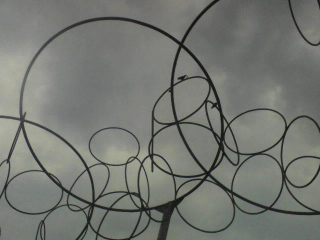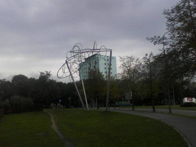 Mateusz Promyk przesłał mi dziś dwa zdjęcia metalowej kompozycji, która znajduje się u zbiegu Alei Solidarności i ul. Zwycięstwa. Bardzo Ci dziękuję! Już wiele razy chciałam zrobić im zdjęcie, ale nigdy nie było mi aż na tyle po drodze, a kiedy już znalazłam się w tamtych okolicach, nie miałam przy sobie aparatu. Co przedstawia ta rzeźba – trudno stwierdzić. Jest bowiem dość abstrakcyjna, a powstała chyba przy okazji masowego ozdabiania miasta przed centralnymi dożynkami w roku 1973, prawda? Również z tej okazji ustawiono przy ulicy Kawaleryjskiej herb miasta na metalowym stelażu. Jeżeli się mylę, proszę, poprawcie mnie :) Najważniejsze, że mimo upływu czasu i zmiany systemów, nikt nie wpadł na pomysł, aby te „koła” zlikwidować :)