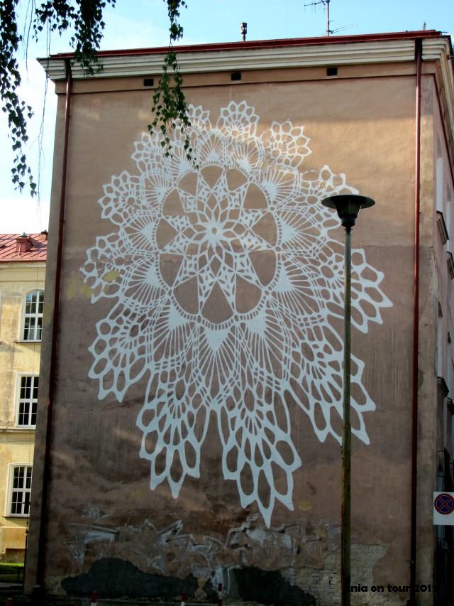 Najnowszy białostocki mural bardzo często pojawiał się i wciąż pojawia się w Internecie. Nie ma się czemu dziwić – faktycznie jest bardzo udany, doskonale wykonany i w 100% zasługuje na to internetowe szaleństwo wokół niego. Też nie mogłam oprzeć się jego urokowi. To jednak nie jedyny folklorystyczny mural w Białymstoku. Już pewien czas temu na jednym z budynków przylegających do Pałacu Branickich wykonano muralową koronkę, która jednak od samego początku jest mało widoczna i wygląda tak jakoś nieświeżo … Również na murze wokół Stadionu Miejskiego w Zwierzyńcu dopatrzymy się ludowych elementów (zdjęcia wciąż jeszcze nie posiadam, może ktoś z Was mógłby mi jakieś podesłać?). Stali Czytelnicy wiedzą, że lubię wszelkiego rodzaju malowidła ścienne i zawsze szczerze cieszę się z kolejnych powstających w Białymstoku (ale dlaczego jest ich wciąż tak mało?!). A może kojarzycie z widzenia jeszcze inne, niewymienione tutaj przeze mnie, ścienne malowidła folklorystyczne? Więcej moich postów o muralach i innych, między innymi ściennych znaleziskach, znajdziecie w zakładce „graffiti” oraz „szyldy i malowidła” po prawej stronie :)