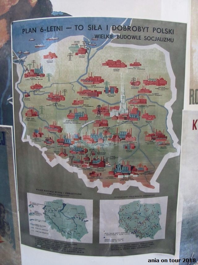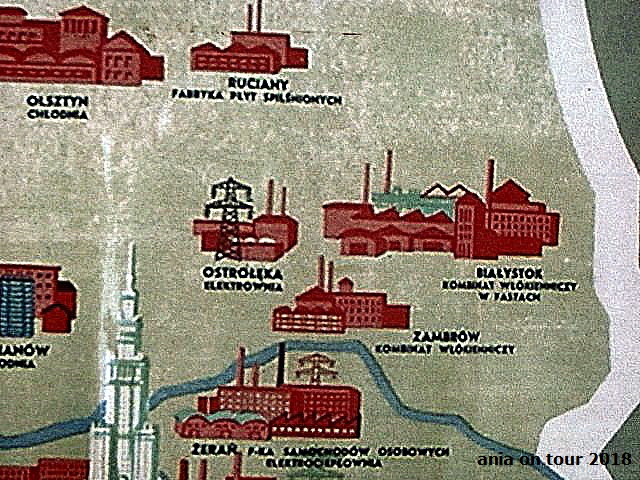 Wróćmy jednak do Kozłówki. Socrealizm to oczywiście nie lata 80, w których się urodziłam, lecz okres dużo wcześniejszy. W Kozłówce znajdziemy pomniki, obrazy, rzeźby, grafiki czy plakaty z lat 50. Natknęłam się tam między innymi na plakat ilustrujący założenia PLANU 6-LETNIEGO z mapką Polski i naniesionymi nań wielkimi budowlami socjalizmu. Przy Białymstoku umieszczono oczywiście Kombinat Włókienniczy w Fastach.