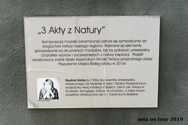 W listopadzie miną trzy lata od momentu odsłonięcia prac Pauliny Horby zatytułowanych 3 Akty z Natury. Na ścianie Białostockiego Teatru Lalek możemy podziwiać obrazy z motywami z trzech środowisk: leśnego, ptasiego i zwierzęcego. Każdy motyw przedstawiono w osobnej ramie. Mnie najbardziej spodobały się chyba żubry, aczkolwiek każda z prac do mnie przemawia i jest według mnie spójna jako całość. Chciałoby się rzec: Pani Paulino, więcej takich instalacji!