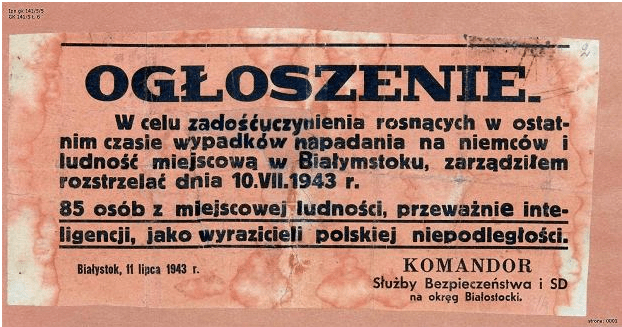 W białostockim oddziale IPN-u znajduje się dokument informujący o planowanym rozstrzelaniu 85 przedstawicieli lokalnej ludności w ramach zadośćuczynienia za napady na Niemców:
