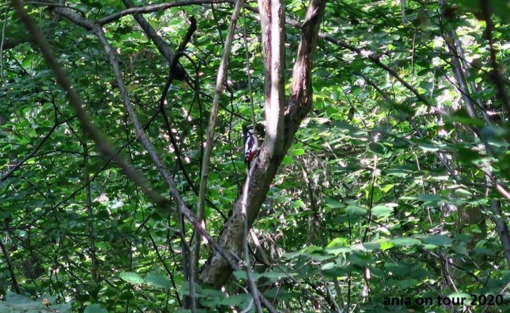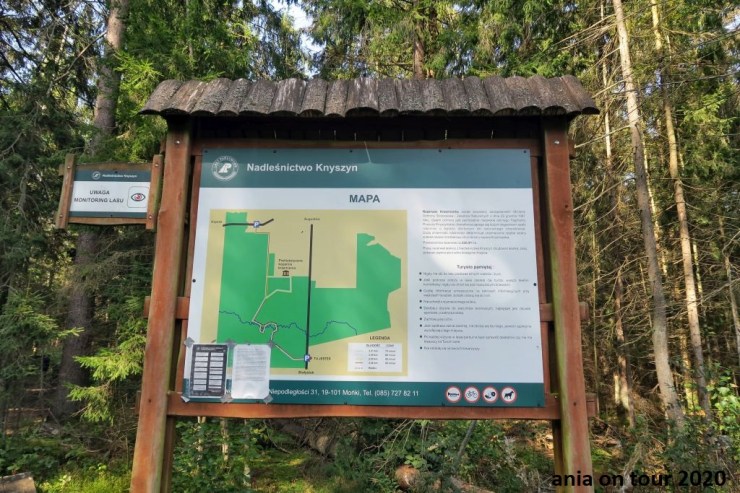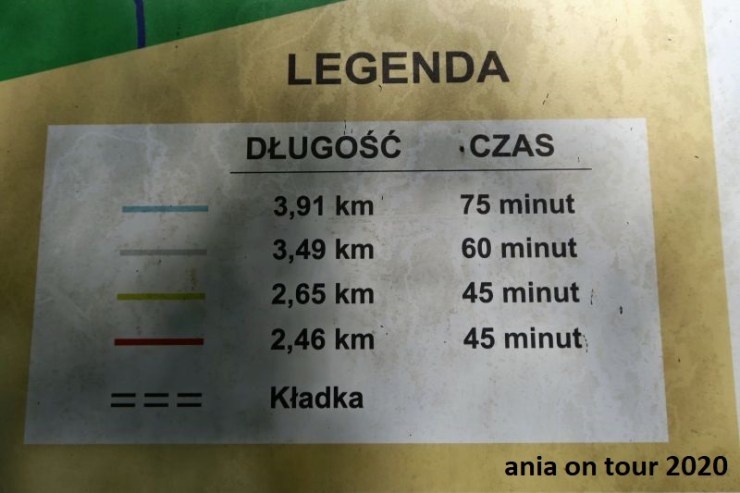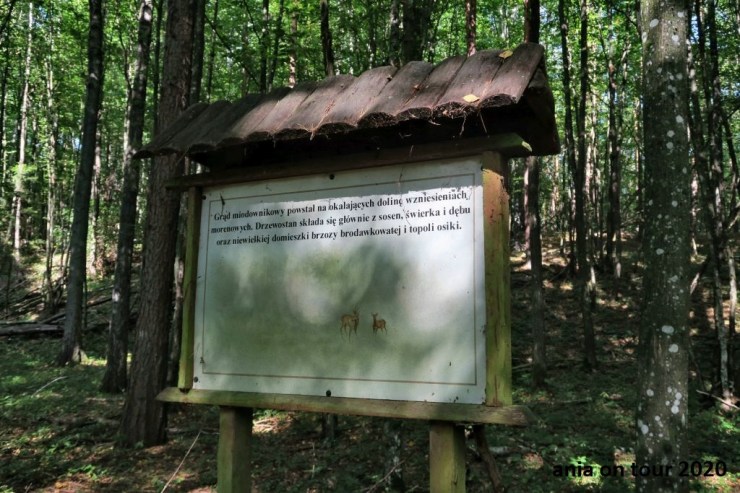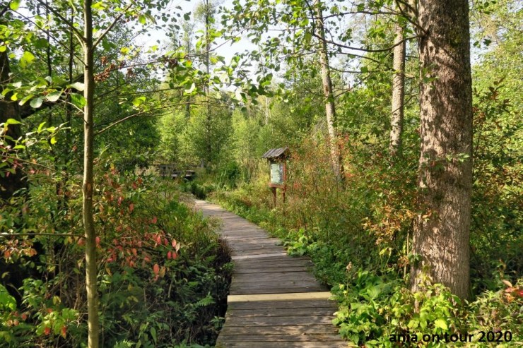 Na trasie widzieliśmy kilka rodzin z wózkami dziecięcymi. Jeżeli jesteście gotowi przenosić wózek przez te wyboiste fragmenty drogi i pęknięte deski na kładce, to taki spacer jest możliwy. Ale nie liczcie na to, że przez puszczę biegnie autostrada z równych jak stół desek :) Trasy są za to z pewnością optymalne dla kilkulatków pokonujących już nieco dłuższe dystanse na piechotę. Podczas wędrówki napotkamy na wiele ciekawych tablic edukacyjnych, w tym na przykład na ptasi zegar czy informacje o dzięciołach i możliwości wystąpienia u tych ptaków wstrząsu mózgu. Same dzięcioły także spotkamy :)