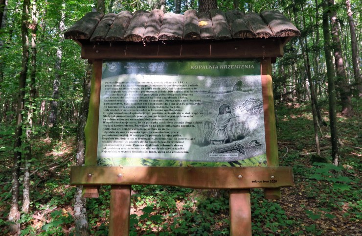 Obszar, na którym funkcjonowały kopalnie krzemienia zdecydowanie wyróżnia się ze względu na budowę terenu. W tym miejscu znajdziemy też zdecydowanie więcej kamieni niż w innych częściach lasu. Zdjęcie z tablicą informacyjną o kopalni krzemienia można powiększyć.