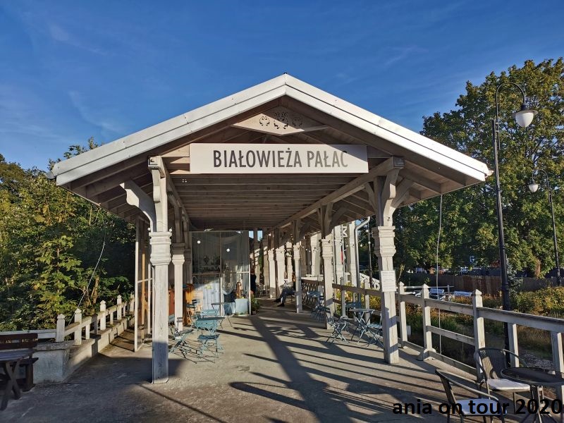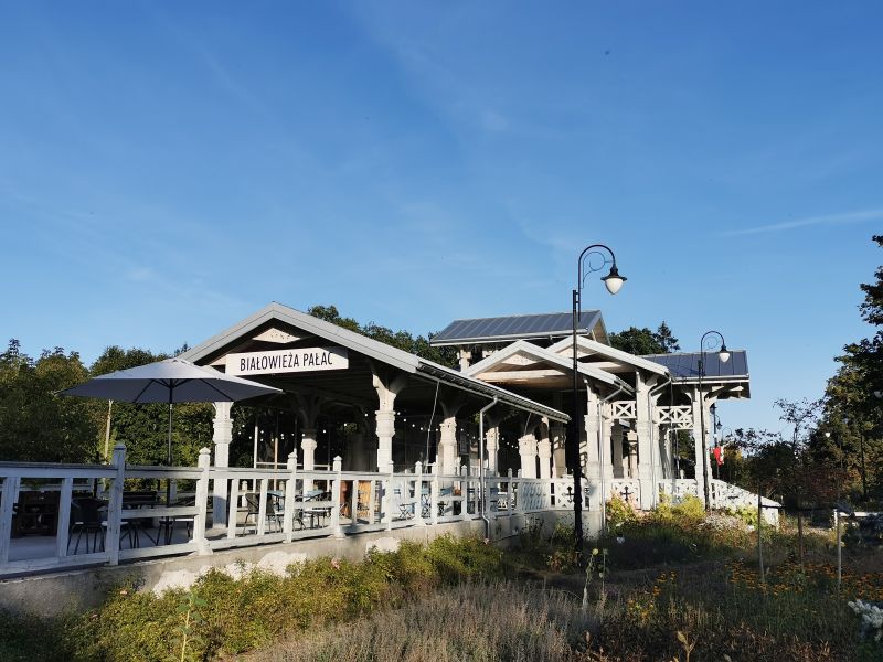W centralnym punkcie Białowieży znajdowała się kiedyś stacja kolejowa. Mój tata spędzał w dzieciństwie kolonie w Białowieży i docierał tam właśnie pociągiem. Obecnie połączenie kolejowe już nie funkcjonuje, ale w miejscu dawnej stacji odrestaurowano pawilon dworca Białowieża Pałac. Nie jest to wierna kopia, ponieważ oryginalny budynek był dłuższy i zorientowany w stronę parku i pałacu. W pawilonie mieści się sezonowa kawiarnia, która stała się chyba ulubionym instaspotem w Białowieży, a obok rozpościera się ogród edukacyjny z oryginalnym placem zabaw. Uwaga – wstęp na teren Białowieży Pałac jest płatny (stan na wrzesień 2020 r. – 6 zł od osoby), niezależnie od tego, czy planujemy wizytę w kawiarni, czy przebywanie na placu zabaw.