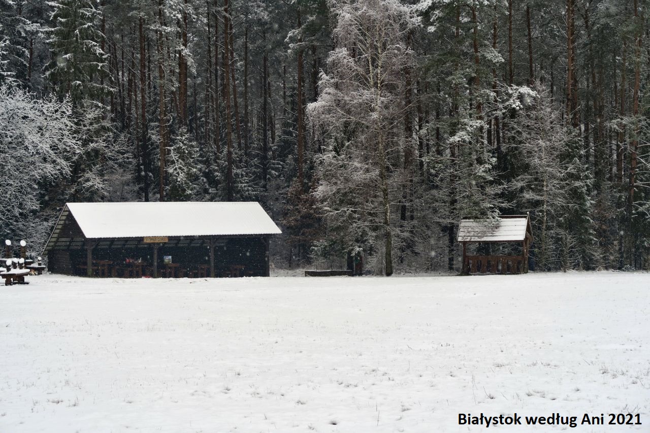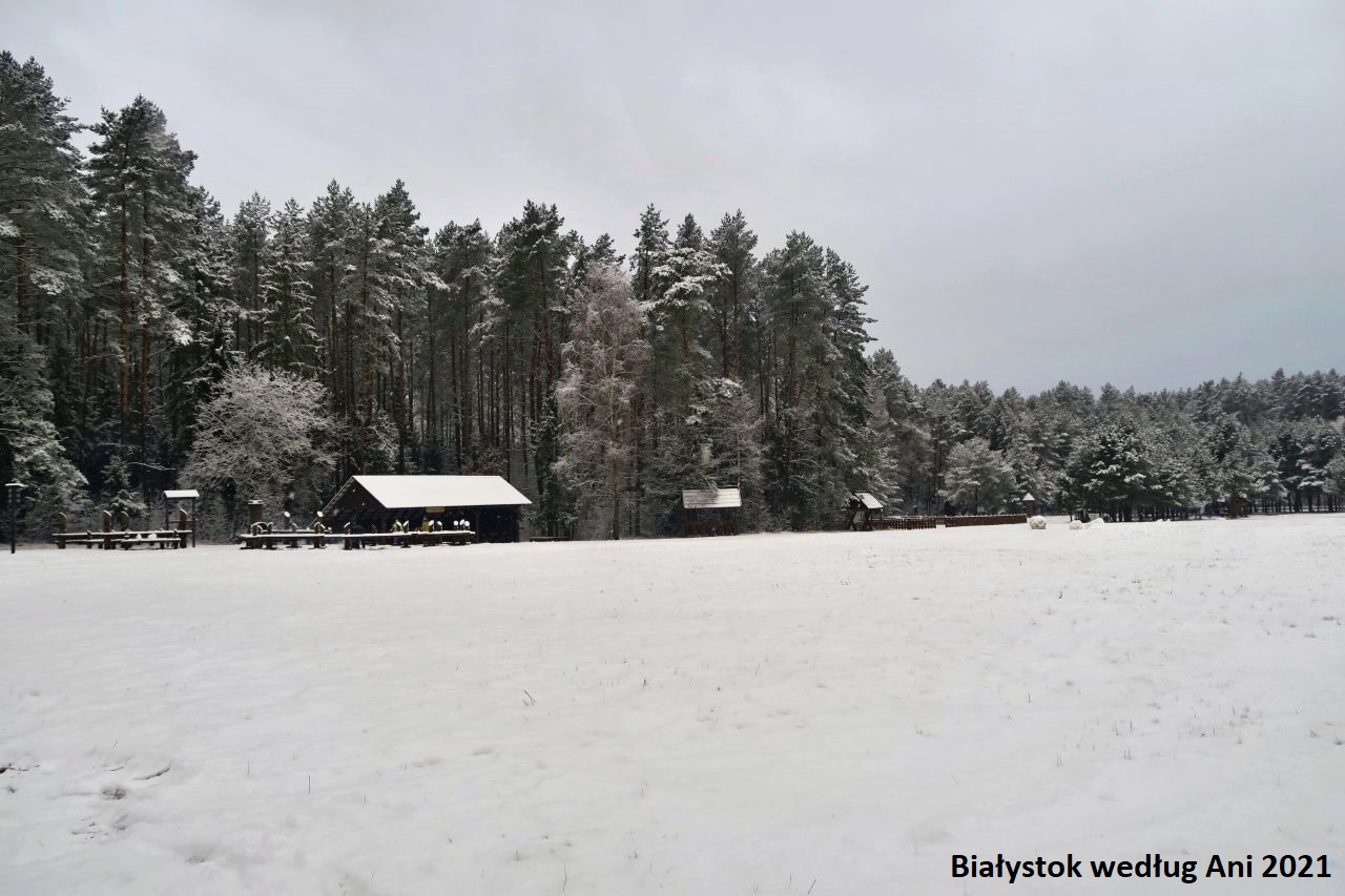 Polana w Kopnej Górze to świetne miejsce na odpoczynek i na ognisko. Znajduje się tam wiele zadaszonych stolików, duża wiata z grillem i liczne miejsca na ogniska. Teren jest zagospodarowany. Możemy poczytać także o roli Puszczy Knyszyńskiej w czasie walk powstańczych czy o… żubrach. Wiecie, że powstaje tam Zagroda pokazowa żubrów? Na razie jeszcze wstęp wzbroniony, ale zapowiada się imponująco.