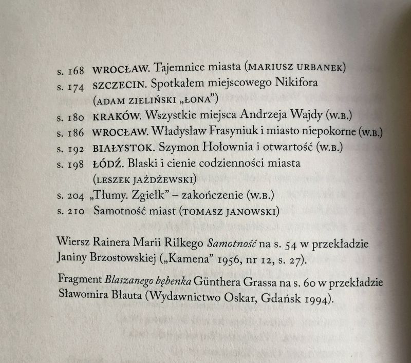 Kupiłam tę książkę w antykwariacie, ponieważ lubię czytać felietony o miastach. Albo inaczej: lubię miasta. Interesuje mnie, jak są postrzegane, jaka panuje w nich atmosfera i co wpływa na tożsamość ich mieszkańców. Jednym z moich ulubionych przedmiotów szkolnych była geografia. Mogę spędzić długie godziny oglądając mapy i plany miast, do dziś potrafię wymienić wszystkie miasta wojewódzkie przed reformą administracyjną w 1999 roku, a najlepsza zabawa w trasie to odczytywanie rejestracji mijanych samochodów. Od dzieciństwa dużo podróżowaliśmy, w trakcie studiów zaczęłam odkrywać kraj na własną rękę. Wsiadało się w poranny pociąg do jakiegoś miasta, jechało na intensywne zwiedzanie i wracało do Warszawy późnym wieczorem. Piękne czasy! Każde odwiedzone miasto wywołuje we mnie emocje, dość szybko czuję, czy dołączy do mojej osobistej listy faworytów i czy będę chciała do niego wracać. Dlatego lubię poczytać, co o znanych mi miastach sądzą inni. Czy mamy podobne wrażenia? Czy mocno się różnimy?