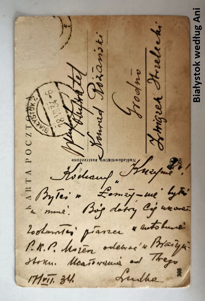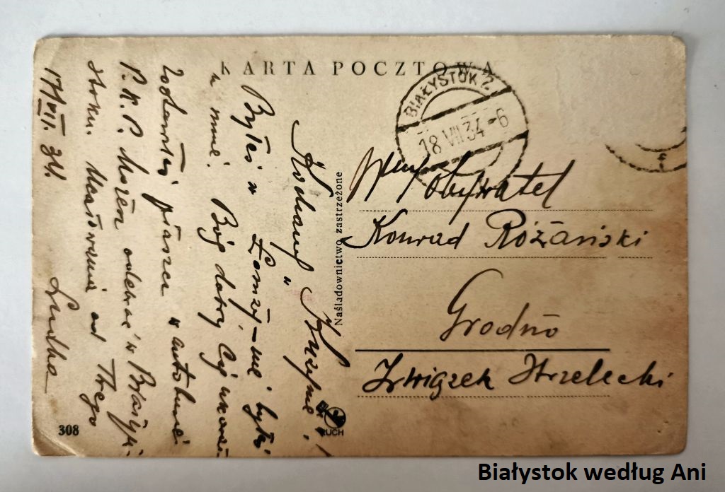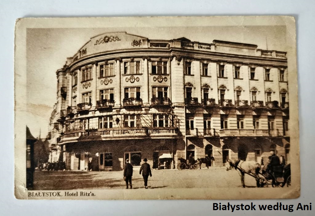 Przeglądałam ostatnio starsze książki o Białymstoku i natrafiłam na przedwojenną pocztówkę z Hotelem Ritz. Niestety już bez znaczka, ale data na stemplu pocztowym jest doskonale widoczna: 18 VII 1934 r. Widokówkę nadano do Grodna. Tekst wiadomości jest doskonale widoczny – dziś byłby to zwykły SMS, a kiedyś aż kartka pocztowa :)