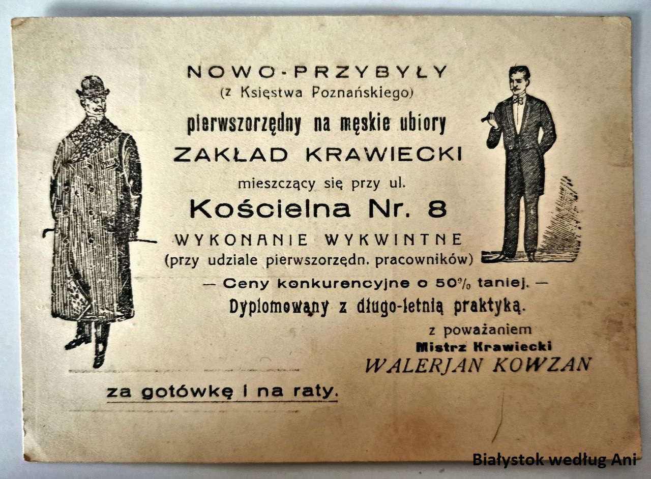 Znalazłam także dawną ulotkę reklamową zakładu krawieckiego z ulicy Kościelnej 8.