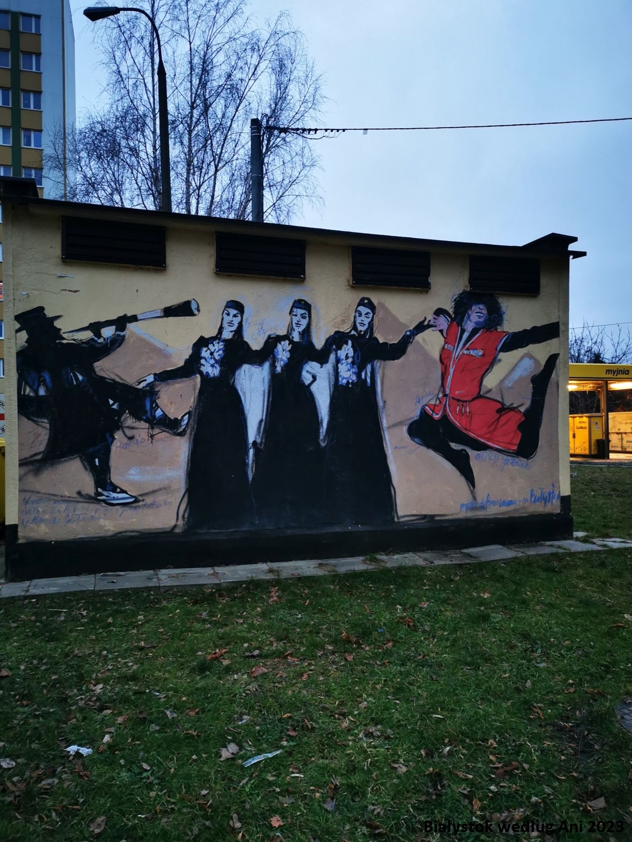 Przy okazji warto wspomnieć, że oprócz dużych i słynnych murali jak Tkana opowieść, na Białostoczku znajdziemy też mniejsze formy. Nieopodal SP 26 od kilku lat możemy podziwiać mural przedstawiający czeczeńskich tancerzy, krymskie Tatarki oraz muzyka w tradycyjnym lokalnym stroju. Lokalizacja nie jest przypadkowa, ponieważ do tej podstawówki uczęszcza dość liczna grupa dzieci czeczeńskich uchodźców. Autorem muralu jest Rafał Roskowiński, a w trakcie prac nad tym ściennym malowidłem brały udział dzieci z wspomnianej szkoły. Pamiętacie zespół taneczny Lovzar, który podbił kiedyś serca widzów Mam talent? Wśród tancerzy byli też uczniowie SP 26.