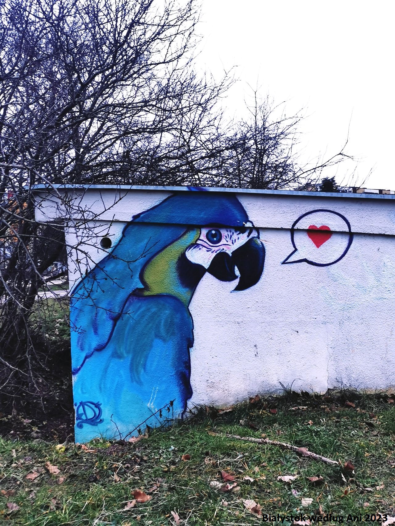 A na zakończenie sympatyczna papuga z ulicy Radzymińskiej. Nie znam autora, ale bardzo ją lubię i zawsze uśmiecham się w duchu, kiedy ją mijam :) Autorze/Autorko – jeśli to czytasz, to serdecznie Cię pozdrawiam!