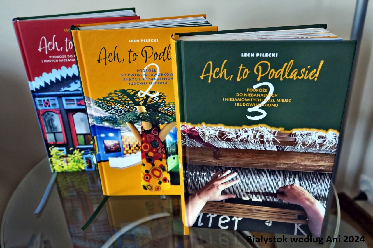 Pierwszy tom został wydany przez wydawnictwo Paśny Buriat, a kolejne dwa ukazały się już w ramach selfpublishingu. Każda z książek jest skonstruowana według podobnego schematu. Województwo podlaskie zostało podzielone na powiaty, a w każdym z powiatów czeka nas subiektywny wybór miejsc dokonany przez autora. Część pierwsza skupiła się na dworkach, pałacach i niebanalnych budynkach regionu, a kolejne tomy uwzględniają już instytucje kulturalne, pomniki, świątynie, dworce, pracownie oraz spotkania z twórcami ludowymi i pasjonatami. Oprócz ogólnego zarysu danego miejsca na czytelnika czeka dużo kolorowych zdjęć. Mamy zatem do czynienia z podobnym konceptem jak u Wojciecha Koronkiewicza. Wiem, że to nie wielkie opasłe tomy traktujące o historii regionu, ale zdecydowanie zachęcają do podróżowania po całym województwie i motywują do poszukiwania często zapomnianych atrakcji lub odkurzenia dawnych historii. Czytając takie podróżnicze zapiski, widzę siebie samą, która od dzieciństwa namawiała Rodziców na wycieczki w okolicach Białegostoku, a później również po Suwalszczyźnie. Lata lecą, a ja niewiele się zmieniłam – podróżujemy nadal, ale w większym składzie :) Ponownie mam wielką ochotę na bardziej intensywną eksplorację Podlaskiego. I tak bym nazwała te książki – Ach, to Podlaskie! :)