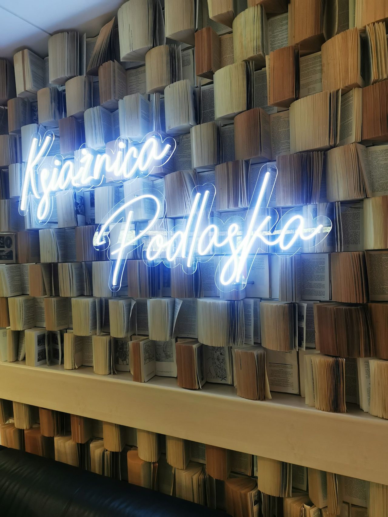 W głównej siedzibie Książnicy Podlaskiej jest też słynna książkowa ścianka z neonem, przy której fotografują się wszyscy zapraszani w progi tej instytucji goście, dlatego często można ją zobaczyć w instagramowych relacjach.