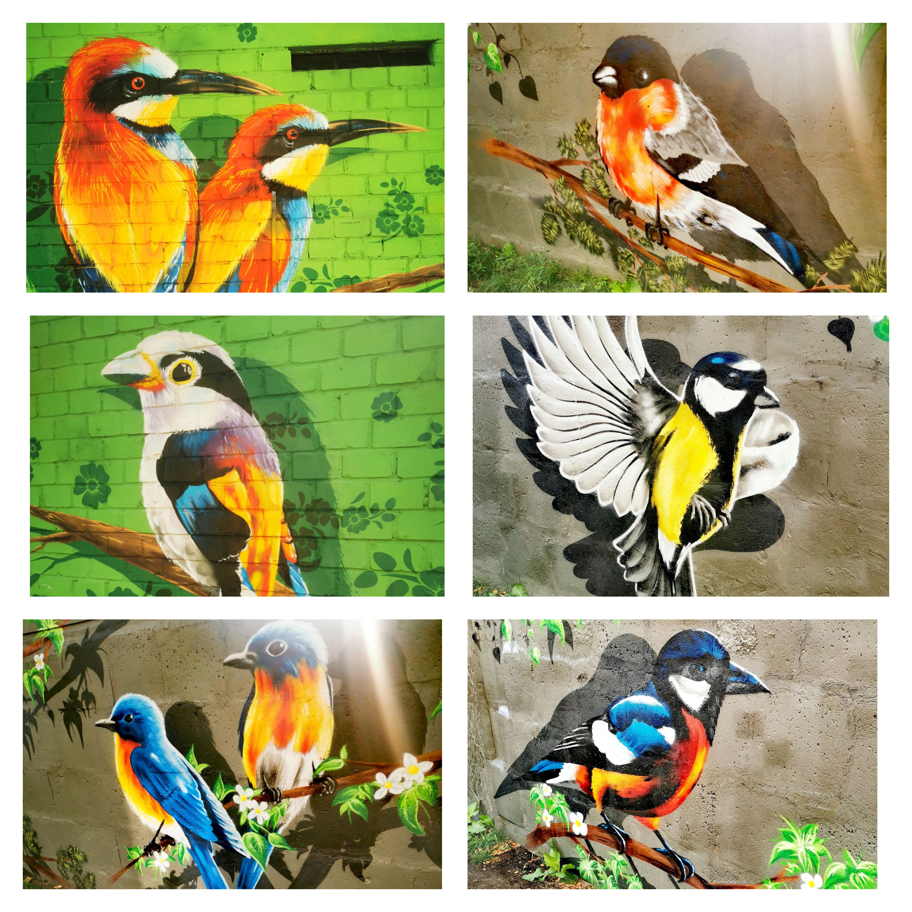 W Białymstoku przybyło też skrzydlatych przyjaciół :) Oprócz papugi ary na Białostoczku i znanych już ptaków ze stacji trafa przy Krakowskiej (na zielonym tle w kolażu poniżej), mamy kolejne ptasie murale.