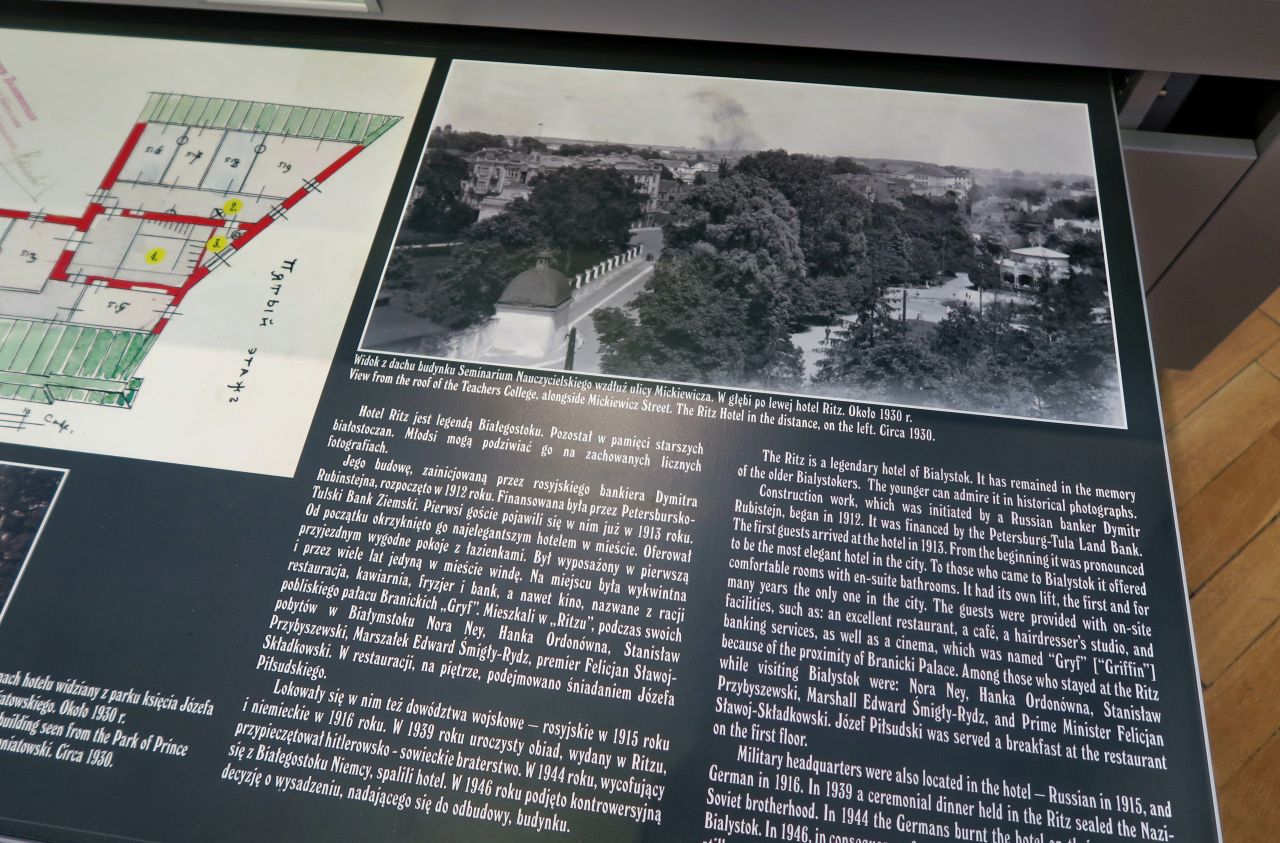 Na piętrze możemy obejrzeć model nieodżałowanego Hotelu Ritz i zapoznać się z jego historią. Moi Dziadkowie doskonale pamiętali ten budynek z okresu przedwojennego i jego rozbiórkę. Ich Białystok był zupełnie inny niż mój… Myślę, że to jeden z tych budynków, którego będziemy żałować już zawsze. Jednocześnie staje się on symbolem utraconego Białegostoku, tęsknoty za miastem, którego już nigdy nie zobaczymy i którego klimatu nigdy nie poczujemy. Ritz wraca do nas na szczęście w sferze kultury i sztuki. Kto nie widział spektaklu Hotel Ritz. Musical w Białostockim Teatrze Lalek, ten… musi to czym prędzej nadrobić. Mąż mojej koleżanki określił to przestawienie mianem „spektaklu samouwielbienia białostoczan”. Ujął to idealnie – to spektakl o nas, o naszych tęsknotach, przywarach, marzeniach. Bardzo silnie zakorzeniony w lokalności. Żeby go w pełni zrozumieć, trzeba swoje pomieszkać i pożyć w Białymstoku.