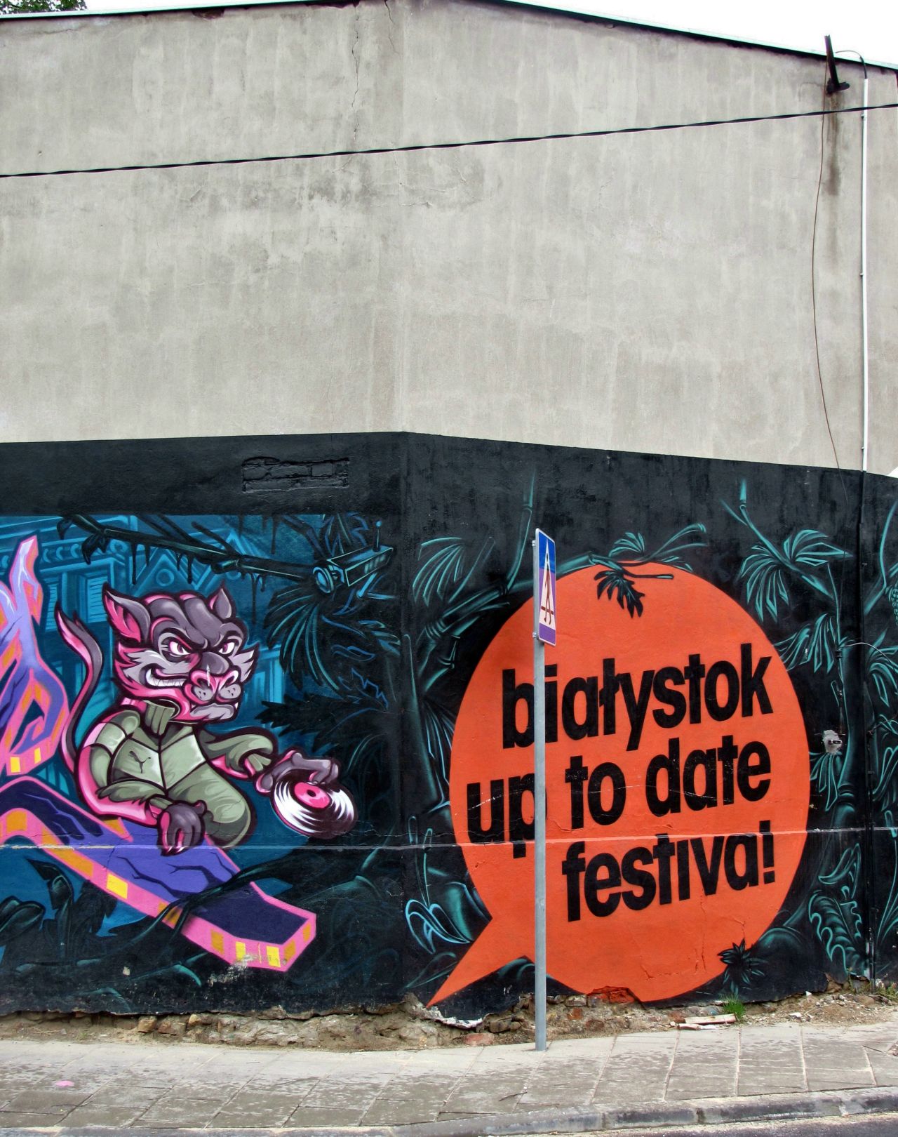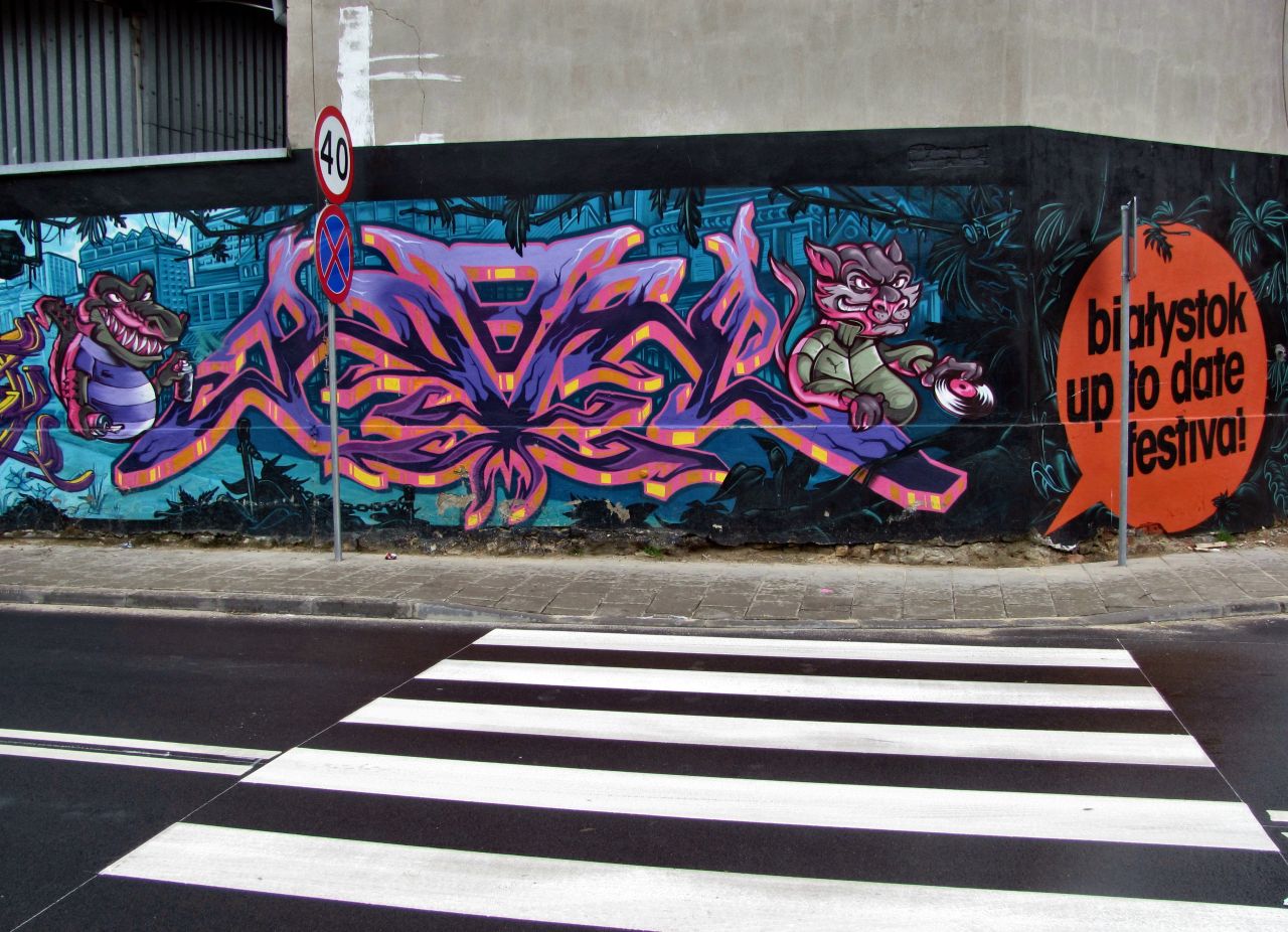 Czy pamiętacie jeszcze te wielkie murale na murze wzdłuż ulicy Kraszewskiego? Napis Białystok z symbolami czterech religii, później murale związane z kolejnymi edycjami festiwalu Up To Date. Bardzo podobał mi się ten niebieski z białym napisem Music is everything. Do tego stopnia, że stanowił tło naszej plenerowej sesji ślubnej. Dziś muru już nie ma – w tym miejscu wybudowano komisariat policji.